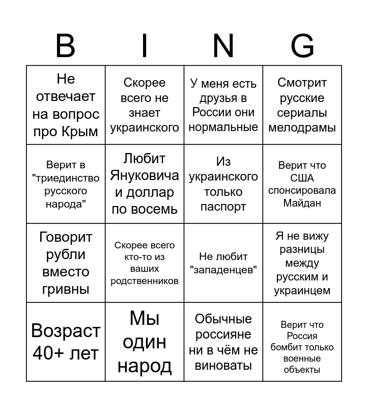 This bingo card has 16 words: Мы один народ, Я не вижу разницы между русским и украинцем, У меня есть друзья в России они нормальные, Не отвечает на вопрос про Крым, Говорит рубли вместо гривны, Скорее всего не знает украинского, Не любит "западенцев", Обычные россияне ни в чём не виноваты, Верит в "триединство русского народа", Любит Януковича и доллар по восемь, Возраст 40+ лет, Смотрит русские сериалы мелодрамы, Скорее всего кто-то из ваших родственников, Верит что США спонсировала Майдан, Из украинского только паспорт and Верит что Россия бомбит только военные объекты.
