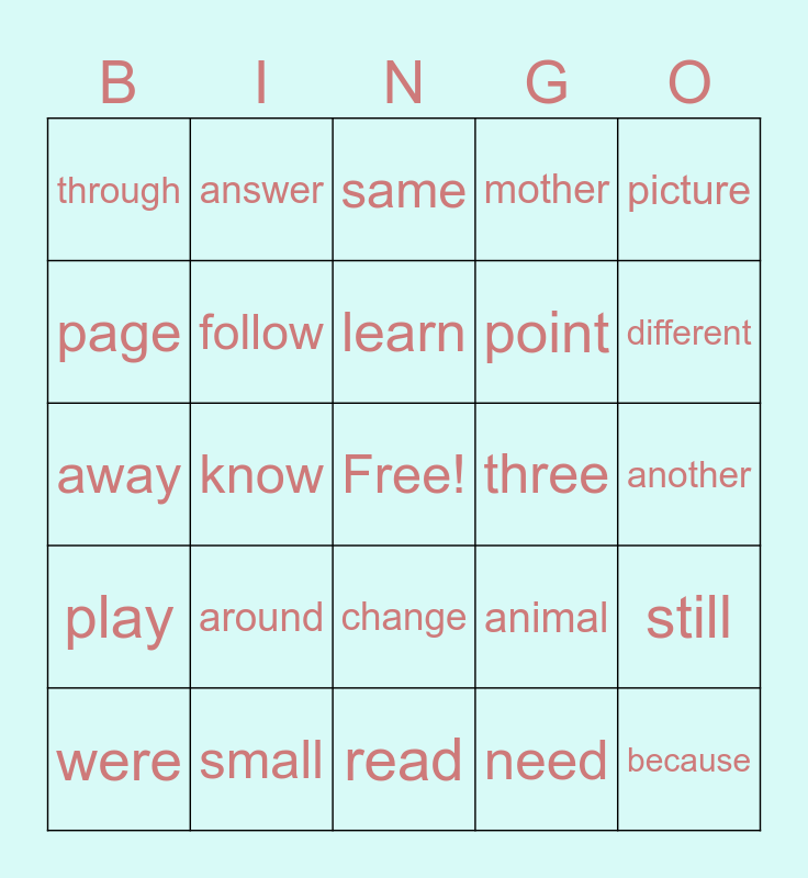 This bingo card has a free space and 29 words: were, sound, know, sentence, through, same, follow, around, three, small, another, because, read, need, different, home, change, play, picture, away, animal, house, point, page, mother, answer, still, learn and America.