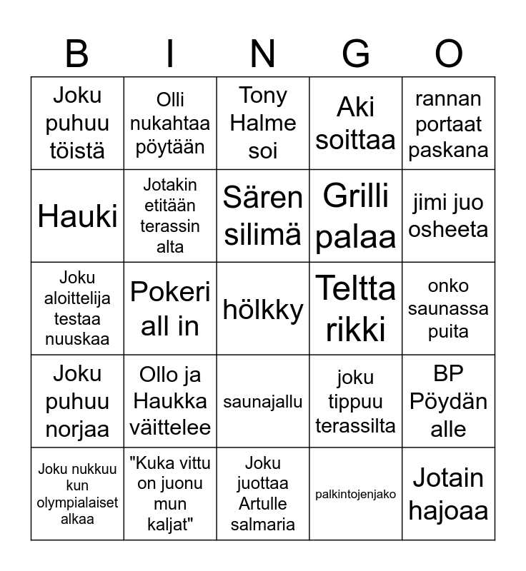 This bingo card has 27 words: joku tippuu terassilta, Jotain hajoaa, Grilli palaa, Joku juottaa Artulle salmaria, Hauki, Tony Halme soi, Olli nukahtaa pöytään, Joku puhuu norjaa, Teltta rikki, BP Pöydän alle, Joku aloittelija testaa nuuskaa, Aki soittaa, Joku nukkuu kun olympialaiset alkaa, "Kuka vittu on juonu mun kaljat", jimi juo osheeta, Jollaki menee musiikki tunteisiin, Jotakin etitään terassin alta, Sären silimä, Ollo ja Haukka väittelee, Joku puhuu töistä, onko saunassa puita, palkintojenjako, Pokeri all in, hölkky, saunajallu, rannan portaat paskana and Ei oo rakenteet lämmenny.