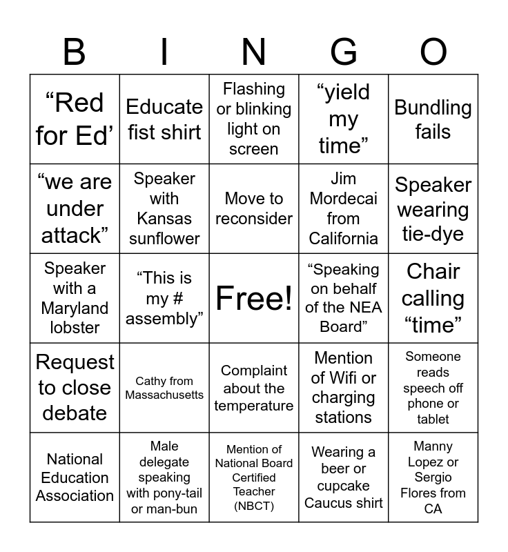This bingo card has a free space and 116 words: Mark Airgood, Speaker from Maine, Speaker from Florida, “from the great state of...”, Wearing a pink shirt, First time delegate speaker, “yield my time”, Point of information, Point of order, “Cost per member?”, Hawaiian or Bowling shirt, Call for division, Tanya Kappner from California, Person in silly hat or hair accessories, Speaker from Mississippi, Complaint about the noise, Complaint about the temperature, Speaker from Colorado, Speaker says “solidarity”, Person acting foolish in background, National Education Association, Flashing or blinking light on screen, Anything disparaging to Betsy DeVos, Friendly amendment, President “shhh’s” the crowd, Request to close debate, Male delegate speaking with pony-tail or man-bun, Speaker argues with Chair, Knitting in the background, Speaker wearing a bowtie, Speaker wearing tie-dye, Move to reconsider, “This is my # assembly”, Person sleeping in background, Wearing a sports team jersey or hat, “suspend the rules”, Complement (sucking up) to the President, Outside of American English accent at microphone, Wearing sunglasses in the background, “speaking on behalf of...”, Wearing a Disney shirt or hat, “home of the...”, Speaker with hair dyed a color not found in nature, Speaker with facial piercing, Speaker using a visual aid, Request for roll call vote, Wearing a beer or cupcake Caucus shirt, “we are under attack”, Alice O’Brian, General Counsel, Eating or drinking in background, Pacific Islander beads or lei, “Speaking on behalf of the NEA Board”, Speaker on behalf of a caucus, Uses the term “bundle”, Speaker references “Democracy”, Elected official speaks, Member of the Executive Committee speaks, Microphone confusion, Speaker with face paint, Fedora or hat other than ball cap, Someone reads speech off phone or tablet, Someone sings live, Executive Director Kim Anderson, Amendment to the amendment, Bald person speaks, Dancing on camera, Speaker with Alaska jacket, Speaker with Kansas sunflower, Speaker with a Maryland lobster, chair self-corrects herself, Chair calling “time”, Chair scolds the body or someone for rules violation, State president speaking, Speaker who identifies themselves as retired, Speaker who identifies self as an Aspiring Educator, Manny Lopez or Sergio Flores from CA, Cathy from Massachusetts, “Red for Ed’, PAC or Fund, Someone cracking a joke, Challenge the chair, Educate fist shirt, Speaker who states their pronouns, Mention of Wifi or charging stations, Jim Mordecai from California, “win all the things”, Speaker from Connecticut or Delaware, Speaker mentions the President, Speaker from New Jersey, Speaker from Massachusetts, Speaker from TNT state (Northern Tier States) WY, SD, ND, MT, AK, ID, State officer in costume etc… likely from the Fund., Obvious rainbow or pride flag on or around speaker, Obvious American flag or stars and stripes on or around speaker, Bundling fails, Close debate, Point of Order, Speaker reading off a phone, Speaker reading off actual paper, Speaker mentions SCOTUS, Princess Moss speaks, Someone speaks in a language other than English, Shane Parmely from CA, Len Paolillo from MA, Speaker from Kentucky, “existing media channels”, “Strategic Plan”, “Trauma”, Mention of National Board Certified Teacher (NBCT), Speaker from Hawaii, Speaker from New York, Speaker uses pronouns, Speaker from CO, Mention of unfilled positions or teacher shortage, “The Fund” and “National Education Association”.