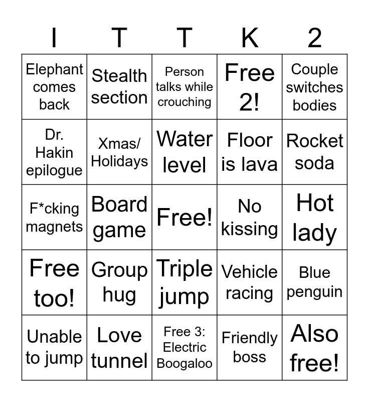 This bingo card has a free space and 24 words: Group hug, Love tunnel, Water level, Unable to jump, Couple switches bodies, Elephant comes back, Dr. Hakin epilogue, Stealth section, No kissing, Triple jump, Floor is lava, F*cking magnets, Vehicle racing, Blue penguin, Xmas/ Holidays, Friendly boss, Hot lady, Person talks while crouching, Rocket soda, Board game, Also free!, Free too!, Free 2! and Free 3: Electric Boogaloo.