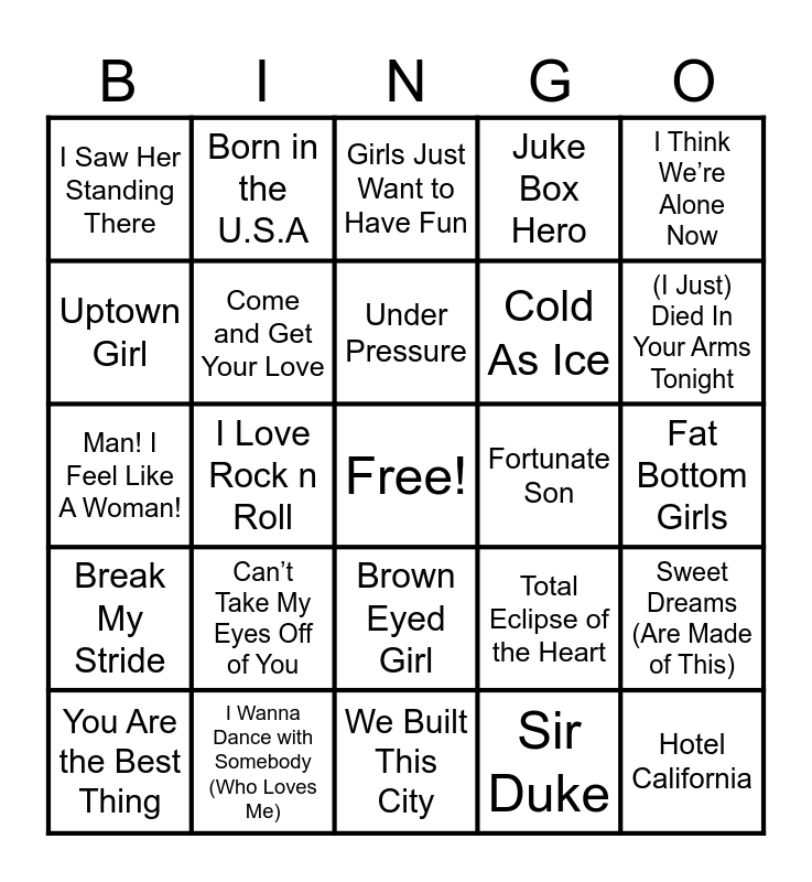 This bingo card has a free space and 39 words: Here Comes the Sun, Paradise City, O-o-h Child, Come and Get Your Love, You Are the Best Thing, Brown Eyed Girl, Under Pressure, Don’t Stop Me Now, I Think We’re Alone Now, Break My Stride, I Love Rock n Roll, Juke Box Hero, Hotel California, Fat Bottom Girls, Fortunate Son, Can’t Take My Eyes Off of You, Go On Your Own Way, I Saw Her Standing There, Proud Mary, Total Eclipse of the Heart, Uptown Girl, We Built This City, Cold As Ice, (I Just) Died In Your Arms Tonight, Red Red Wine, Rosanna, Walk Like an Egyptian, Come On Eileen, Sussudio, Born in the U.S.A, Fast Car, You Spin Me Round (Like a Record), Girls Just Want to Have Fun, I Wanna Dance with Somebody (Who Loves Me), Sir Duke, Physical, Sweet Dreams (Are Made of This), Man! I Feel Like A Woman! and Short Skirt / Long Jacket.