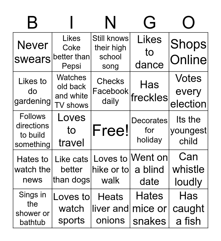 This bingo card has a free space and 24 words: Like cats better than dogs, Loves to watch sports, Checks Facebook daily, Sings in the shower or bathtub, Shops Online, Never swears, Likes to do gardening, Likes Coke better than Pepsi, Decorates for holiday, Loves to hike or to walk, Has freckles, Follows directions to build something, Went on a blind date, Can whistle loudly, Watches old back and white TV shows, Hates mice or snakes, Its the youngest child, Still knows their high school song, Votes every election, Loves to travel, Has caught a fish, Hates to watch the news, Likes to dance and Heats liver and onions.