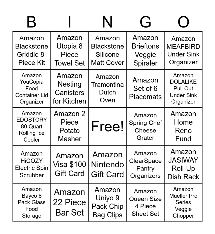 This bingo card has a free space and 70 words: Amazon Gift Card, Amazon Home Reno Fund, Amazon Honeymoon Fund, Amazon KOANEssentials Bins, Amazon 22 Piece Bar Set, Amazon Kitchen Mama Can Opener, Amazon Brieftons Veggie Spiraler, Amazon Salt and Pepper Grinder Set, Amazon MEAFBIRD Under Sink Organizer, Amazon Vanwood Sponge Holder, Amazon JASIWAY Roll-Up Dish Rack, Amazon iRobot Roomba, Amazon Blackstone Griddle 8-Piece Kit, Amazon Blackstone Silicone Matt Cover, Amazon Blackstone Griddle 18-Piece Kit, Amazon 2 Piece Potato Masher, Amazon Nintendo Gift Card, Amazon Set of 6 Placemats, Amazon Dishwasher Magnet, Amazon HiCOZY Electric Spin Scrubber, Amazon Spring Chef Cheese Grater, Amazon ClearSpace Pantry Organizers, Amazon DOLALIKE Pull Out Under Sink Organizer, Amazon BLUE GINKGO Over The Sink Colander Strainer, Amazon AOBORTY Pickelball Paddels Pack of Four, Amazon LANE LINEN Kitchen Towels Set of 6, Amazon Farberware Wood Rolling Pin, Amazon Maetoow Chenille Chunky Knit Blanket, Amazon Queen Size 4 Piece Sheet Set, Amazon CZFWin Glass Jars with Bamboo Lids, Amazon Utopia 8 Piece Towel Set, Amazon Lipper International Salad Set, Amazon Lipper International Serving Bowl, Amazon Furbo Dog Camera, Amazon Zadro Towel Warmer, Amazon Domino’s Pizza Gift Card, Amazon Lowe’s Gift Card, Amazon MR.SIGA Toilet Plunger, Amazon MuellerLiving Hand Blender, Amazon YouCopia Food Container Lid Organizer, Amazon Visa $50 Gift Card, Amazon Visa $100 Gift Card, Amazon Mueller Pro Series Veggie Chopper, Amazon Bissell Little Green Vacuum, Amazon Getstar Kitchen Utensil Holder, Amazon Nesting Canisters for Kitchen, Amazon Bayco 8 Pack Glass Food Storage, Amazon Utopia Kitchen Plastic Food Storage, Amazon Airtight Food Storage Containers, Amazon Kate Spade Salad Bowl, Amazon Cuisinart Food Processor, Amazon Carote Pots and Pans Set, Amazon Sorbus Fridge Bins, Amazon Stardew Valley The Board Game, Amazon Uniyo 9 Pack Chip Bag Clips, Amazon BarnYard Kitchen Canister Set, Amazon Tramontina Dutch Oven, Amazon LaVie Floating Shelves, Amazon EUHOMY Counter Ice Maker, Amazon PICNIC TIME NCAA Cooler, Amazon EDOSTORY 80 Quart Rolling Ice Cooler, Amazon FamiWare MilkyWay Plates and Bowls, Target 4 Pack Hand/ Wash Towel Set, Target Woven Dotted Line Shower Curtain, Target Queen Firm Cool Touch Memory Foam Pillow, Target Intex 120V Quick Fill Electric Pump, Target Intex Queen Air Mattress, Target Lodge 12” Cast Iron Skillet, Target Cuisinart Classic 15 Piece Knife Set and Target Ninja Never Dull 12 Piece Knife System.