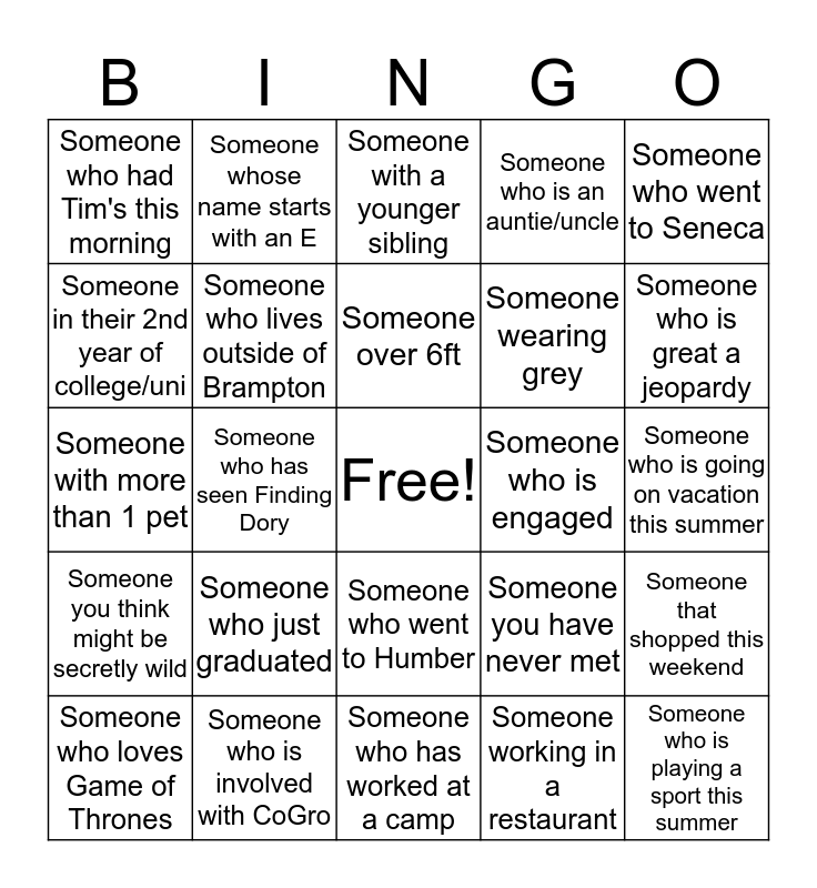 This bingo card has a free space and 24 words: Someone who just graduated, Someone who is involved with CoGro, Someone over 6ft, Someone who loves Game of Thrones, Someone who went to Seneca, Someone who had Tim's this morning, Someone in their 2nd year of college/uni, Someone whose name starts with an E, Someone who is engaged, Someone who went to Humber, Someone wearing grey, Someone with more than 1 pet, Someone you have never met, Someone that shopped this weekend, Someone who lives outside of Brampton, Someone working in a restaurant, Someone who is going on vacation this summer, Someone with a younger sibling, Someone who is great a jeopardy, Someone who has seen Finding Dory, Someone who is playing a sport this summer, Someone you think might be secretly wild, Someone who is an auntie/uncle and Someone who has worked at a camp.