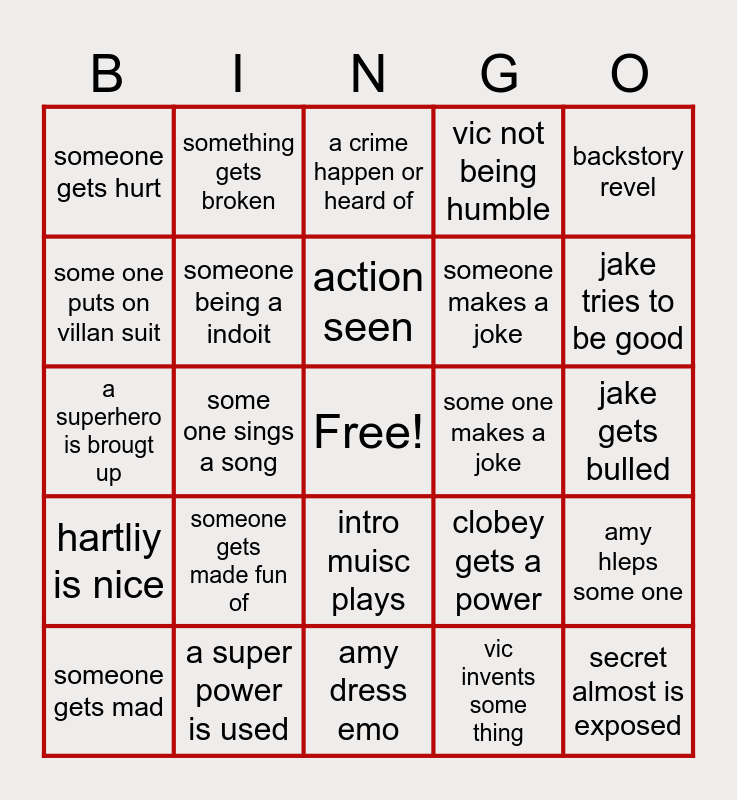 This bingo card has a free space and 24 words: someone gets made fun of, a super power is used, action seen, someone gets mad, backstory revel, someone gets hurt, some one puts on villan suit, something gets broken, some one makes a joke, intro muisc plays, someone makes a joke, a superhero is brougt up, clobey gets a power, amy hleps some one, someone being a indoit, vic invents some thing, jake gets bulled, a crime happen or heard of, jake tries to be good, some one sings a song, secret almost is exposed, hartliy is nice, vic not being humble and amy dress emo.