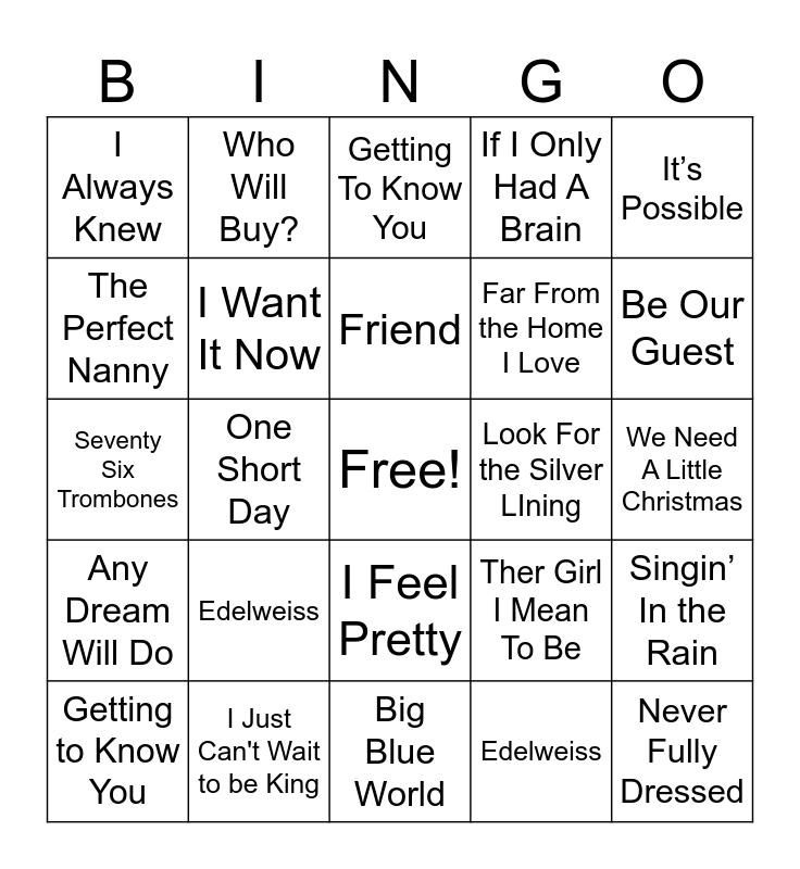 This bingo card has a free space and 25 words: Edelweiss, Big Blue World, Friend, Getting to Know You, It’s Possible, I Always Knew, The Perfect Nanny, Who Will Buy?, Look For the Silver LIning, I Feel Pretty, Far From the Home I Love, Seventy Six Trombones, Ther Girl I Mean To Be, Singin’ In the Rain, I Want It Now, Castle On A Cloud, We Need A Little Christmas, Getting To Know You, Be Our Guest, One Short Day, Never Fully Dressed, I Just Can't Wait to be King, Any Dream Will Do, If I Only Had A Brain and Edelweiss.