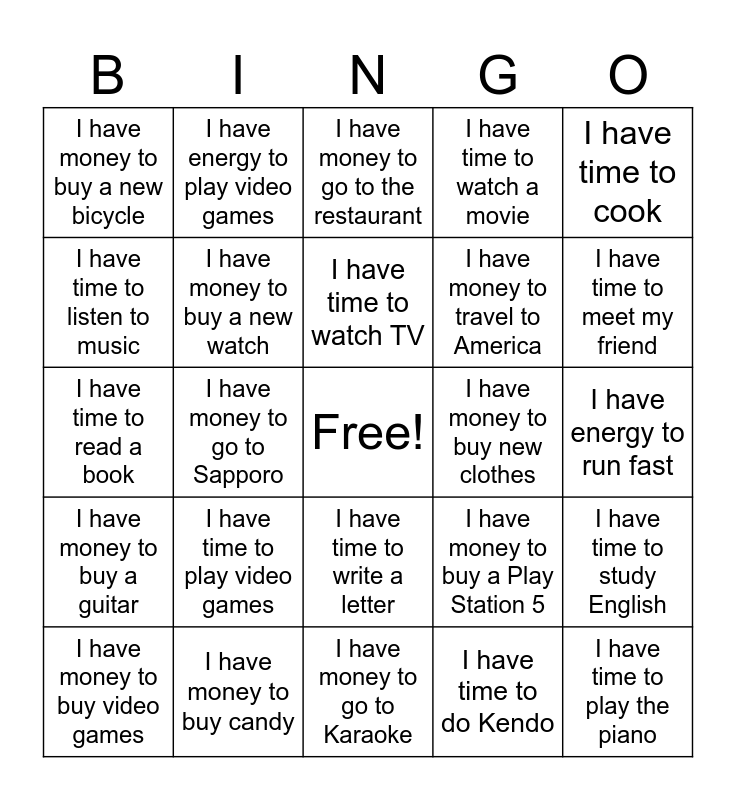 This bingo card has a free space and 24 words: I have time to play video games, I have money to buy candy, I have time to watch TV, I have money to buy video games, I have time to cook, I have money to buy a new bicycle, I have time to listen to music, I have energy to play video games, I have money to buy new clothes, I have time to write a letter, I have money to travel to America, I have time to read a book, I have money to buy a Play Station 5, I have time to study English, I have money to buy a new watch, I have time to do Kendo, I have energy to run fast, I have money to go to the restaurant, I have time to meet my friend, I have money to go to Sapporo, I have time to play the piano, I have money to buy a guitar, I have time to watch a movie and I have money to go to Karaoke.