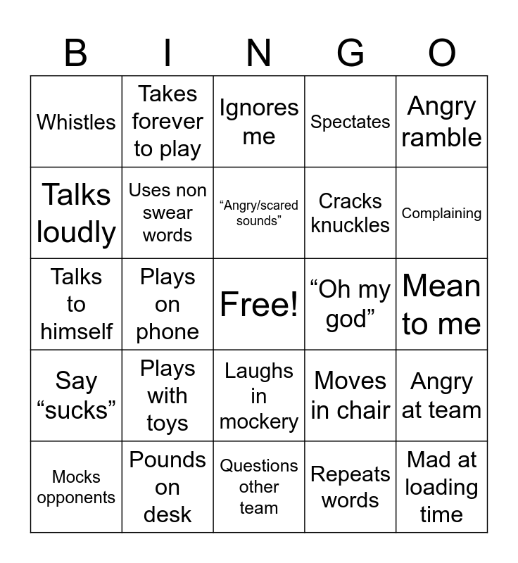 This bingo card has a free space and 24 words: Mocks opponents, Plays with toys, “Angry/scared sounds”, Repeats words, Angry ramble, Whistles, Takes forever to play, Ignores me, “Oh my god”, Mean to me, Talks to himself, Uses non swear words, Moves in chair, Angry at team, Talks loudly, Pounds on desk, Questions other team, Spectates, Complaining, Say “sucks”, Plays on phone, Laughs in mockery, Cracks knuckles and Mad at loading time.