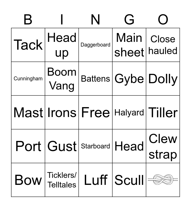 This bingo card has 3 images, a free space and 43 words: Luff, Gust, Lull, Head up, Bear off, Cunningham, Out haul, Boom Vang, Main sheet, Clew strap, Head, Foot, Leech, Battens, Halyard, Run, Close hauled, Irons, Scull, Tack, Gybe, Jib, Dolly, Bow, Stern, Starboard, Port, Windward, Leeward, Painter, Aft, Fore, Ticklers/ Telltales, Tiller, Tiller extension, Rudder, PFD, Buoy, Daggerboard, Mast, Boom, Capsize and Clew.