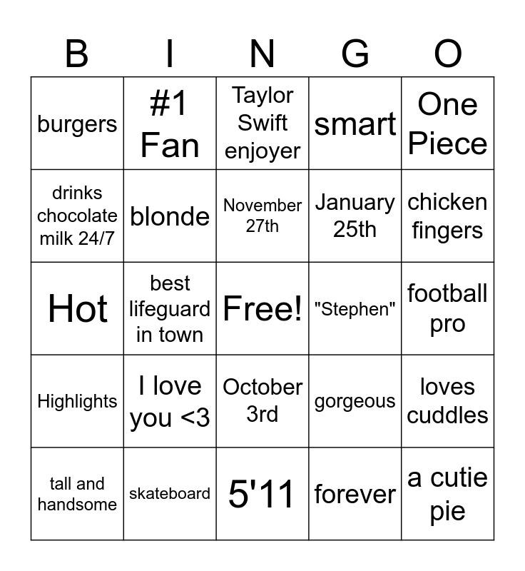 This bingo card has a free space and 24 words: I love you <3, skateboard, November 27th, tall and handsome, One Piece, burgers, drinks chocolate milk 24/7, #1 Fan, "Stephen", October 3rd, January 25th, Hot, gorgeous, loves cuddles, blonde, forever, football pro, Taylor Swift enjoyer, chicken fingers, best lifeguard in town, a cutie pie, Highlights, smart and 5'11.