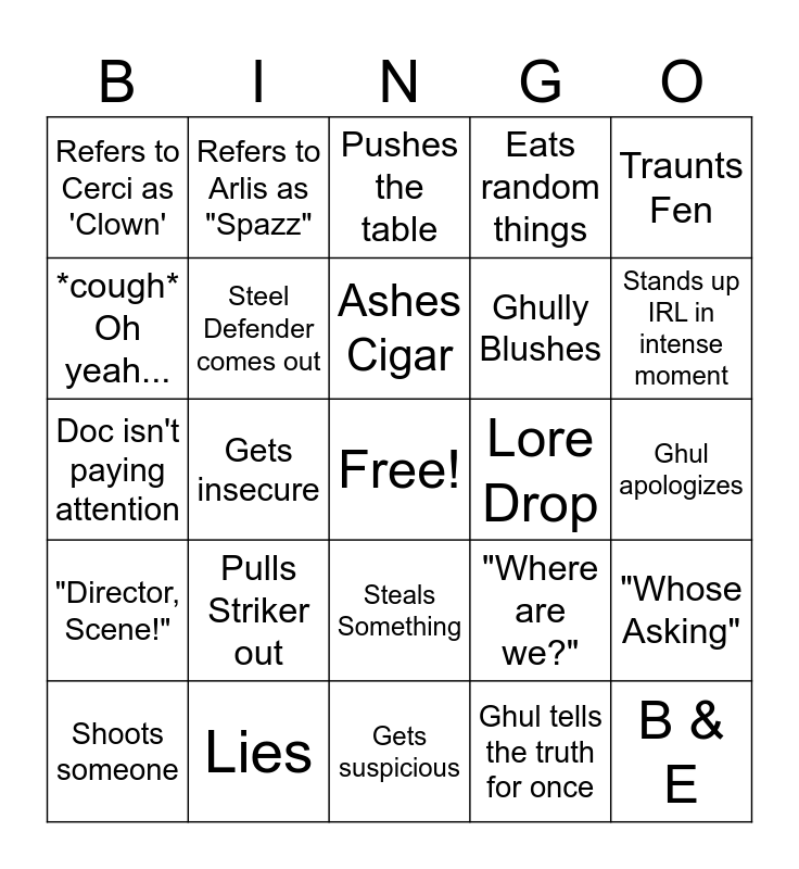 This bingo card has a free space and 24 words: Pulls Striker out, Lies, Ashes Cigar, Shoots someone, Traunts Fen, Refers to Cerci as 'Clown', *cough* Oh yeah..., Refers to Arlis as "Spazz", Lore Drop, Steals Something, Ghully Blushes, Doc isn't paying attention, "Where are we?", "Whose Asking", Steel Defender comes out, Ghul tells the truth for once, Ghul apologizes, Pushes the table, Stands up IRL in intense moment, Gets insecure, B & E, "Director, Scene!", Eats random things and Gets suspicious.