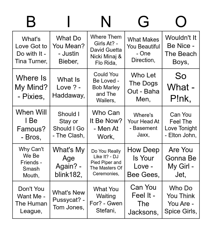 This bingo card has 50 words: Do I Wanna Know? - Arctic Monkeys,, Who Can It Be Now? - Men At Work,, Do You Believe in Magic? - The Lovin Spoonful,, What You Waiting For? - Gwen Stefani,, What's My Age Again? - blink182,, What's Luv? - Fat Joe Ashanti,, What Do You Mean? - Justin Bieber,, What's My Name? - Rihanna Drake,, Where Is My Mind? - Pixies,, 21 Questions - 50 Cent Nate Dogg,, What Is Love ? - Haddaway,, What Makes You Beautiful - One Direction,, Are You Gonna Be My Girl - Jet,, How Deep Is Your Love - Bee Gees,, What's Going On - Marvin Gaye,, Don't Cha - The Pussycat Dolls Busta Rhymes,, Could You Be Loved - Bob Marley and The Wailers,, Where's Your Head At - Basement Jaxx,, Are You Gonna Go My Way - Lenny Kravitz,, Wouldn't It Be Nice - The Beach Boys,, Should I Stay or Should I Go - The Clash,, Can You Feel It - The Jacksons,, What's Love Got to Do with It - Tina Turner,, Who Let The Dogs Out - Baha Men,, Isn't She Lovely - Stevie Wonder,, Who Do You Think You Are - Spice Girls,, So What - P!nk,, Where Is The Love? - Black Eyed Peas,, Where Them Girls At? - David Guetta Nicki Minaj & Flo Rida,, Do You Really Like It? - DJ Pied Piper and The Masters Of Ceremonies,, How Do U Want It? - 2Pac K-Ci and JoJo,, Why Does My Heart Feel so Bad? - Moby,, Why Does It Always Rain On Me? - Travis,, Who Knew - P!nk,, What's New Pussycat? - Tom Jones,, How Will I Know - Whitney Houston,, Do You Know the Way to San Jose - Dionne Warwick,, Do You Really Want To Hurt Me - Culture Club,, Why Do Fools Fall in Love - Frankie Lymon and The Teenagers,, Can You Feel The Love Tonight - Elton John,, (How Much Is That) Doggie In The Window - Patti Page,, Is She Really Going Out With Him? - Joe Jackson,, Would I Lie To You? - Charles and Eddie,, What Does the Fox Say? - Ylvis,, Don't You Want Me - The Human League,, When Will I Be Famous? - Bros,, Have You Seen Her - The Chi Lites,, What Would You Do? - City High,, Why Can't We Be Friends - Smash Mouth, and Why Can't I Be You? - The Cure,.