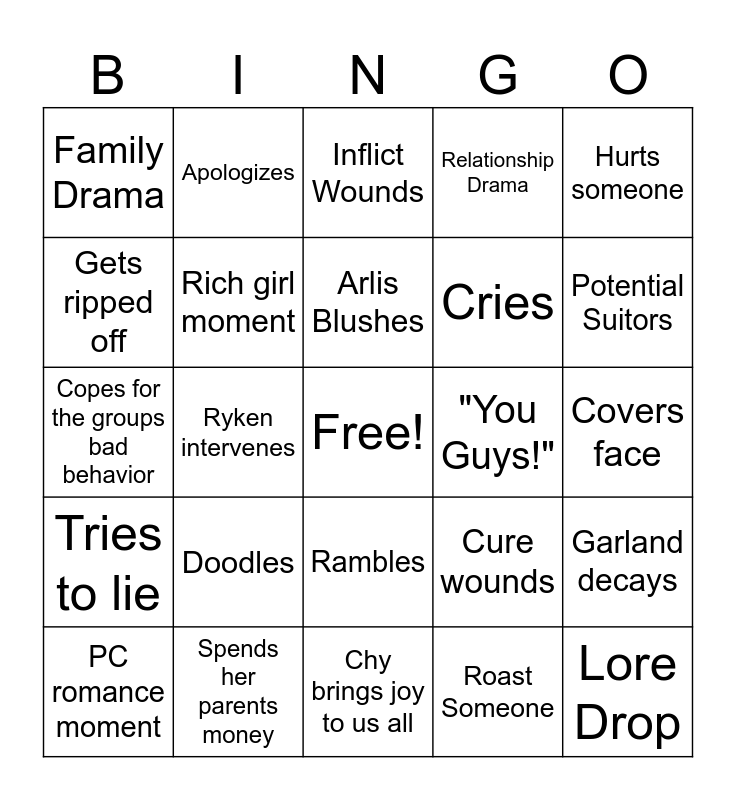 This bingo card has a free space and 24 words: Doodles, Spends her parents money, Arlis Blushes, PC romance moment, Hurts someone, Family Drama, Gets ripped off, Apologizes, "You Guys!", Rambles, Cries, Copes for the groups bad behavior, Cure wounds, Garland decays, Rich girl moment, Roast Someone, Covers face, Inflict Wounds, Potential Suitors, Ryken intervenes, Lore Drop, Tries to lie, Relationship Drama and Chy brings joy to us all.