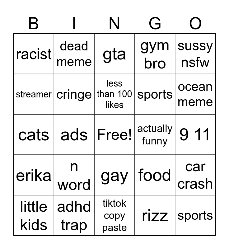 This bingo card has a free space and 24 words: n word, adhd trap, less than 100 likes, little kids, sussy nsfw, racist, streamer, dead meme, actually funny, gay, sports, cats, food, car crash, cringe, rizz, 9 11, gta, ocean meme, ads, sports, erika, gym bro and tiktok copy paste.
