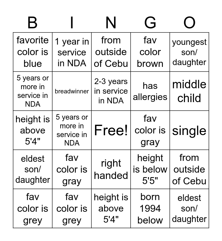 This bingo card has a free space and 72 words: favorite color is pink, 1 year in service in NDA, 5 years or more in service in NDA, can speak multiple dialects (>2), born 1994 below, breadwinner, fav color brown, can swim, has allergies, 2-3 years in service in NDA, fav color is grey, born 1995 to present, middle child, favorite color is blue, married, height is above 5'4", height is below 5'5", youngest son/ daughter, fav color green, single, fav color is gray, eldest son/ daughter, from outside of Cebu, right handed, can speak multiple dialects (>2), married, height is above 5'4", youngest son/ daughter, has allergies, 2-3 years in service in NDA, fav color is grey, born 1995 to present, middle child, favorite color is blue, born 1994 below, breadwinner, fav color brown, height is below 5'5", 5 years or more in service in NDA, from outside of Cebu, right handed, can swim, fav color green, single, fav color is gray, eldest son/ daughter, favorite color is pink, 1 year in service in NDA, eldest son/ daughter, favorite color is pink, 1 year in service in NDA, can speak multiple dialects (>2), has allergies, fav color is gray, height is below 5'5", 5 years or more in service in NDA, from outside of Cebu, 2-3 years in service in NDA, fav color is grey, born 1995 to present, middle child, favorite color is blue, married, height is above 5'4", youngest son/ daughter, born 1994 below, breadwinner, right handed, fav color brown, can swim, fav color green and single.