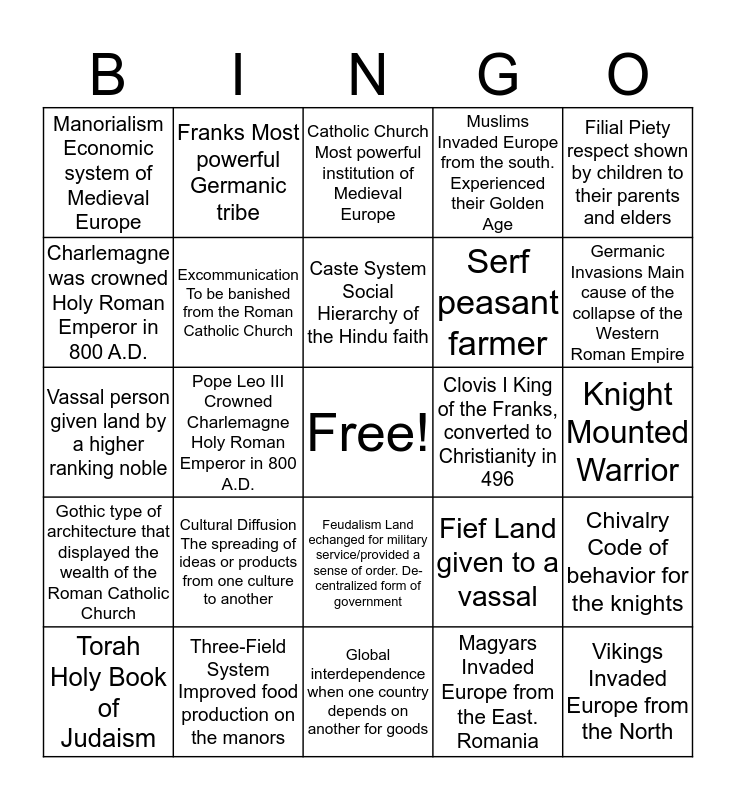 This bingo card has a free space and 25 words: Cultural Diffusion The spreading of ideas or products from one culture to another, Global interdependence when one country depends on another for goods, Caste System Social Hierarchy of the Hindu faith, Torah Holy Book of Judaism, Filial Piety respect shown by children to their parents and elders, Manorialism Economic system of Medieval Europe, Charlemagne was crowned Holy Roman Emperor in 800 A.D., Franks Most powerful Germanic tribe, Clovis I King of the Franks, converted to Christianity in 496, Feudalism Land echanged for military service/provided a sense of order. De-centralized form of government, Serf peasant farmer, Vassal person given land by a higher ranking noble, Fief Land given to a vassal, Chivalry Code of behavior for the knights, Excommunication To be banished from the Roman Catholic Church, Guild like a labor union today. Used to decrease competition between people doing the same job, Knight Mounted Warrior, Catholic Church Most powerful institution of Medieval Europe, Germanic Invasions Main cause of the collapse of the Western Roman Empire, Pope Leo III Crowned Charlemagne Holy Roman Emperor in 800 A.D., Vikings Invaded Europe from the North, Three-Field System Improved food production on the manors, Gothic type of architecture that displayed the wealth of the Roman Catholic Church, Muslims Invaded Europe from the south. Experienced their Golden Age and Magyars Invaded Europe from the East. Romania.