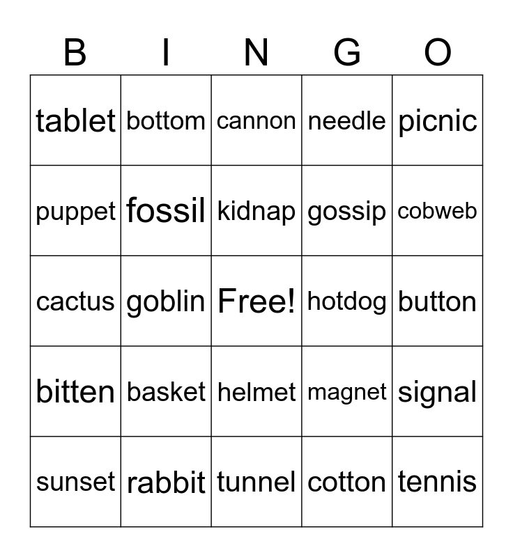 This bingo card has a free space and 24 words: basket, rabbit, kidnap, sunset, picnic, tablet, puppet, bottom, hotdog, helmet, gossip, cactus, magnet, signal, fossil, cotton, button, cannon, cobweb, goblin, tennis, bitten, needle and tunnel.