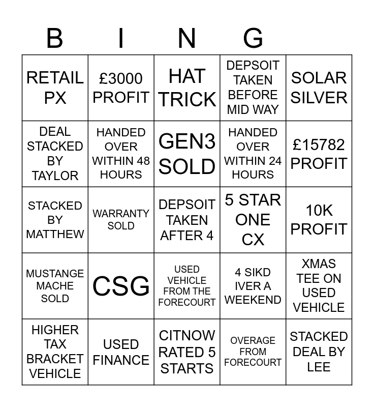 This bingo card has a free space and 24 words: CSG, USED FINANCE, GEN3 SOLD, HIGHER TAX BRACKET VEHICLE, SOLAR SILVER, RETAIL PX, DEAL STACKED BY TAYLOR, £3000 PROFIT, 5 STAR ONE CX, USED VEHICLE FROM THE FORECOURT, HANDED OVER WITHIN 24 HOURS, STACKED BY MATTHEW, 4 SIKD IVER A WEEKEND, XMAS TEE ON USED VEHICLE, HANDED OVER WITHIN 48 HOURS, OVERAGE FROM FORECOURT, 10K PROFIT, HAT TRICK, £15782 PROFIT, WARRANTY SOLD, STACKED DEAL BY LEE, MUSTANGE MACHE SOLD, DEPSOIT TAKEN BEFORE MID WAY and CITNOW RATED 5 STARTS.