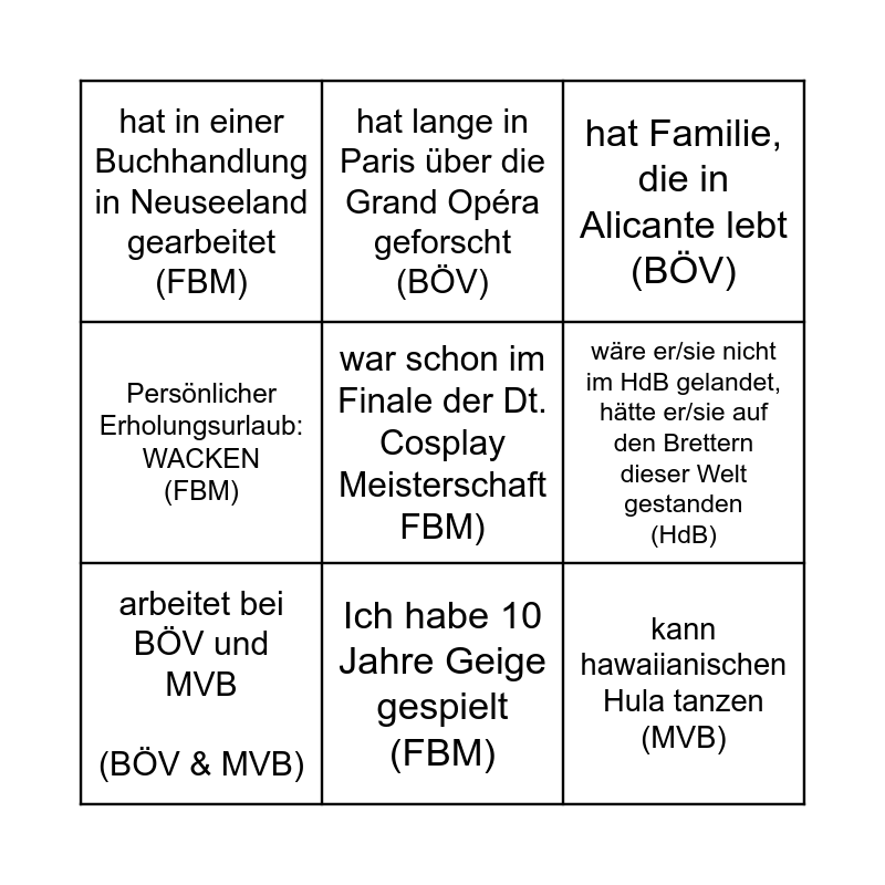This bingo card has 12 words: Wurde schon mal von einem Eichhörnchen gebissen (Mediacampus), Ich habe 10 Jahre Geige gespielt (FBM), kann hawaiianischen Hula tanzen (MVB), Persönlicher Erholungsurlaub: WACKEN (FBM), hat lange in Paris über die Grand Opéra geforscht (BÖV), wäre er/sie nicht im HdB gelandet, hätte er/sie auf den Brettern dieser Welt gestanden (HdB), arbeitet bei BÖV und MVB (BÖV & MVB), hat schon 40 Kostüme genäht (FBM), hat Familie, die in Alicante lebt (BÖV), hat in einer Buchhandlung in Neuseeland gearbeitet (FBM), war schon im Finale der Dt. Cosplay Meisterschaft FBM) and hat das Rettungsschimm-abzeichen in Silber (MVB).