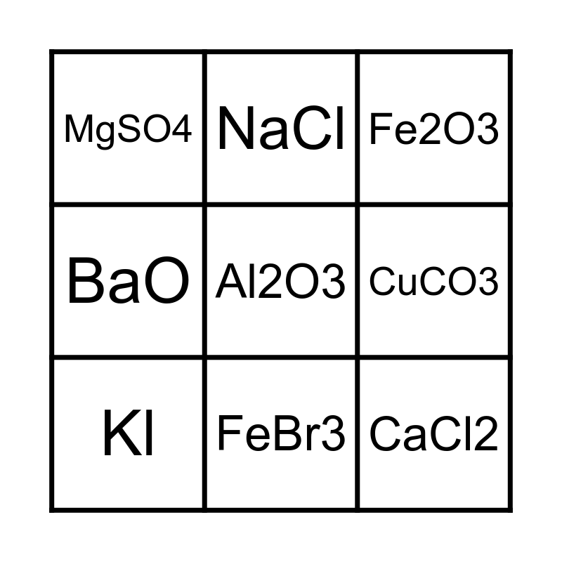 This bingo card has a free space and 8 words: CuCO3, Fe2O3, NaCl, Kl, MgSO4, CaCl2, BaO and FeBr3.
