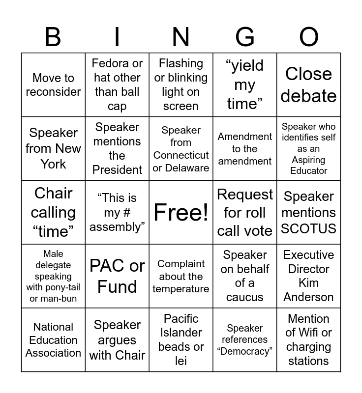 This bingo card has a free space and 112 words: Mark Airgood, Speaker from Maine, Speaker from Florida, “from the great state of...”, Wearing a pink shirt, First time delegate speaker, “yield my time”, Point of information, Point of order, “Cost per member?”, Hawaiian or Bowling shirt, Call for division, Tanya Kappner from California, Person in silly hat or hair accessories, Speaker from Mississippi, Complaint about the noise, Complaint about the temperature, Speaker from Colorado, Speaker says “solidarity”, Person acting foolish in background, National Education Association, Flashing or blinking light on screen, Friendly amendment, President “shhh’s” the crowd, Request to close debate, Male delegate speaking with pony-tail or man-bun, Speaker argues with Chair, Knitting in the background, Speaker wearing a bowtie, Speaker wearing tie-dye, Move to reconsider, “This is my # assembly”, Person sleeping in background, Wearing a sports team jersey or hat, “suspend the rules”, Complement (sucking up) to the President, Outside of American English accent at microphone, Wearing sunglasses in the background, “speaking on behalf of...”, Wearing a Disney shirt or hat, “home of the...”, Speaker with hair dyed a color not found in nature, Speaker with facial piercing, Speaker using a visual aid, Request for roll call vote, Alice O’Brian, General Counsel, Eating or drinking in background, Pacific Islander beads or lei, “Speaking on behalf of the NEA Board”, Speaker on behalf of a caucus, Uses the term “bundle”, Speaker references “Democracy”, Elected official speaks, Member of the Executive Committee speaks, Microphone confusion, Speaker with face paint, Fedora or hat other than ball cap, Someone reads speech off phone or tablet, Someone sings live, Executive Director Kim Anderson, Amendment to the amendment, Bald person speaks, Dancing on camera, Speaker with Alaska jacket, Speaker with Kansas sunflower, Speaker with a Maryland lobster, chair self-corrects herself, Chair calling “time”, Chair scolds the body or someone for rules violation, State president speaking, Speaker who identifies themselves as retired, Speaker who identifies self as an Aspiring Educator, Manny Lopez or Sergio Flores from CA, Cathy from Massachusetts, “Red for Ed’, PAC or Fund, Someone cracking a joke, Challenge the chair, Educate fist shirt, Speaker who states their pronouns, Mention of Wifi or charging stations, “win all the things”, Speaker from Connecticut or Delaware, Speaker mentions the President, Speaker from New Jersey, Speaker from Massachusetts, Speaker from TNT state (Northern Tier States) WY, SD, ND, MT, AK, ID, State officer in costume etc… likely from the Fund., Obvious rainbow or pride flag on or around speaker, Obvious American flag or stars and stripes on or around speaker, Bundling fails, Close debate, Point of Order, Speaker reading off a phone, Speaker reading off actual paper, Speaker mentions SCOTUS, Princess Moss speaks, Someone speaks in a language other than English, Shane Parmely from CA, Len Paolillo from MA, Speaker from Kentucky, “existing media channels”, “Strategic Plan”, “Trauma”, Mention of National Board Certified Teacher (NBCT), Speaker from Hawaii, Speaker from New York, Speaker uses pronouns, Speaker from CO, Mention of unfilled positions or teacher shortage, “The Fund” and “National Education Association”.