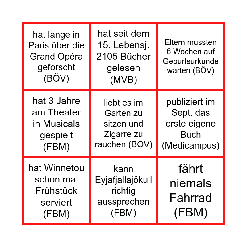This bingo card has 20 words: wurde schon mal von einem Eichhörnchen gebissen (Medicampus), hat wiss. Arbeiten über J.R.R. Tolkien & Star Wars geschrieben (FBM), Eltern mussten 6 Wochen auf Geburtsurkunde warten (BÖV), persönlicher Erholungsurlaub: WACKEN (FBM), kann den hawaiianischen Hula tanzen (MVB), liebt es im Garten zu sitzen und Zigarre zu rauchen (BÖV), war 6 Jahre Pfadfinder (FBM), hat lange in Paris über die Grand Opéra geforscht (BÖV), fährt niemals Fahrrad (FBM), hat seit dem 15. Lebensj. 2105 Bücher gelesen (MVB), hatte als Kind 9 Meer-schweinchen (BÖV), hat einen Teil der Kindheit im Himalaya verbracht (HdB), publiziert im Sept. das erste eigene Buch (Medicampus), wollte ursprünglich Köchin werden (FBM), hat Winnetou schon mal Frühstück serviert (FBM), hat schon 21x an der FBM teilgenommen (MVB), kann Eyjafjallajökull richtig aussprechen (FBM), hat 3 Jahre am Theater in Musicals gespielt (FBM), hat einen Zwilling (FBM) and wurde schon mal von einem Wolf gebissen (BÖV).