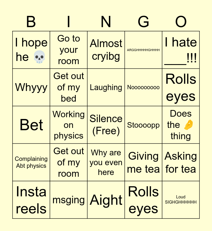 This bingo card has a free space and 24 words: Get out of my room, msging, Laughing, Insta reels, I hate ___!!!, I hope he 💀, Whyyy, Go to your room, Stoooopp, Why are you even here, Nooooooooo, Bet, Giving me tea, Asking for tea, Get out of my bed, Rolls eyes, Does the 🤌 thing, Almost cryibg, Rolls eyes, Working on physics, Loud SIGHGHHHHHH, Complaining Abt physics, ARGGHHHHHGHHHH and Aight.