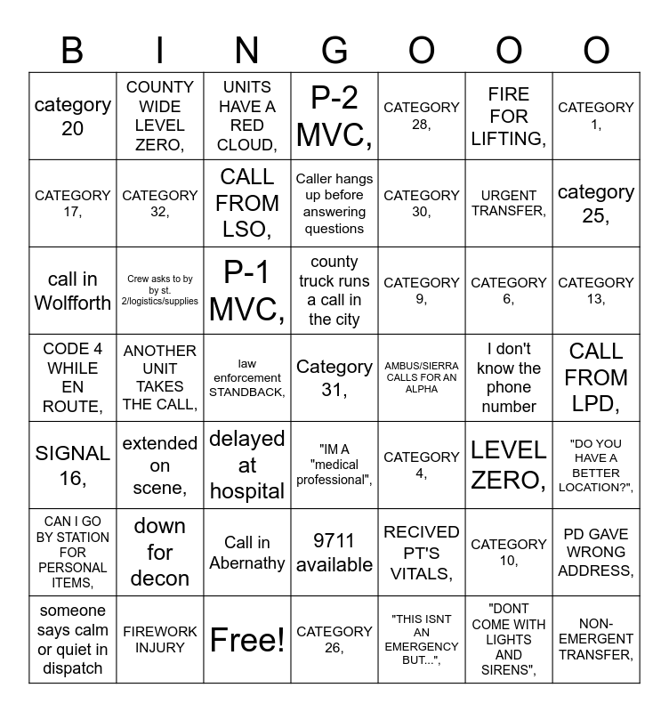 This bingo card has 53 words: Free!, URGENT TRANSFER,, MEDICAL ALARM,, law enforcement STANDBACK,, P-1 MVC,, "DO YOU HAVE A BETTER LOCATION?",, COUNTY WIDE LEVEL ZERO,, NON-EMERGENT TRANSFER,, FIRE FOR LIFTING,, CAN I GO BY STATION FOR PERSONAL ITEMS,, CATEGORY 1,, CATEGORY 4,, CATEGORY 6,, CATEGORY 9,, CATEGORY 10,, CATEGORY 13,, CATEGORY 17,, category 25,, CATEGORY 26,, CATEGORY 28,, CATEGORY 30,, Category 31,, CATEGORY 32,, category 20, "THIS ISNT AN EMERGENCY BUT...",, CODE 4 WHILE EN ROUTE,, SIGNAL 16,, "DONT COME WITH LIGHTS AND SIRENS",, CALL FROM LPD,, CALL FROM LSO,, "I DONT KNOW THE ADDRESS",, "IM A "medical professional",, RECIVED PT'S VITALS,, PD GAVE WRONG ADDRESS,, LEVEL ZERO,, extended on scene,, P-2 MVC,, ANOTHER UNIT TAKES THE CALL,, UNITS HAVE A RED CLOUD,, down for decon, Call in Abernathy, 9711 available, call in Wolfforth, level 1, someone says calm or quiet in dispatch, county truck runs a call in the city, I don't know the phone number, delayed at hospital, Caller hangs up before answering questions, Crew asks to by by st. 2/logistics/supplies, FIREWORK INJURY, AMBUS/SIERRA CALLS FOR AN ALPHA and FOX TRUCK NEEDED FOR BLOOD.