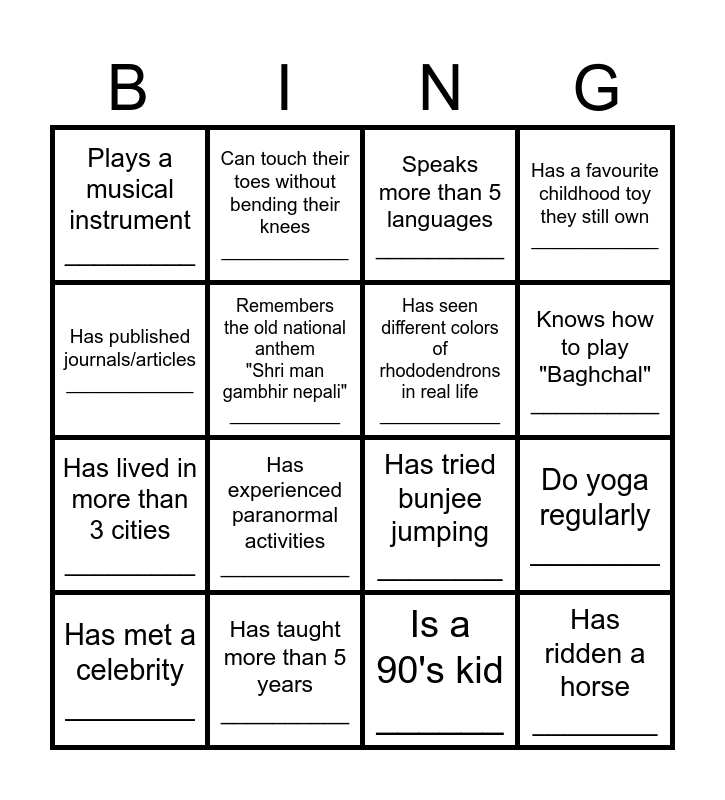 This bingo card has 16 words: Has taught more than 5 years __________, Do yoga regularly ________, Speaks more than 5 languages __________, Plays a musical instrument _________, Has lived in more than 3 cities _________, Can touch their toes without bending their knees ____________, Has tried bunjee jumping ________, Is a 90's kid ______, Has published journals/articles ____________, Remembers the old national anthem "Shri man gambhir nepali" ___________, Has met a celebrity ________, Has a favourite childhood toy they still own ____________, Has experienced paranormal activities ___________, Knows how to play "Baghchal" __________, Has seen different colors of rhododendrons in real life ____________ and Has ridden a horse ________.
