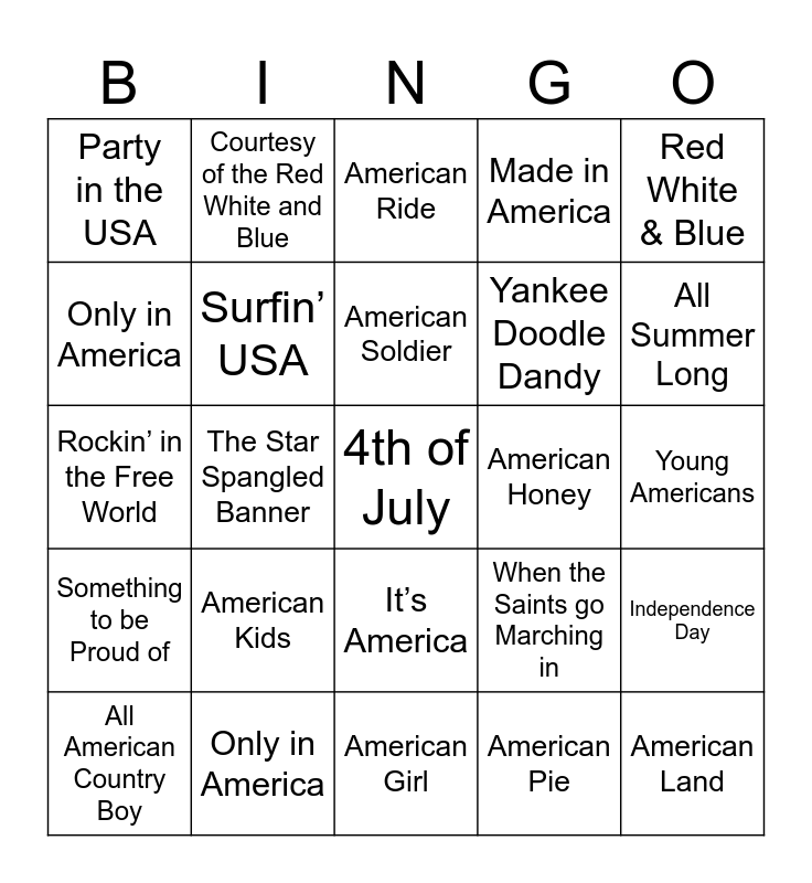 This bingo card has 50 words: Free!, 4th of July, Born in the USA, American Girl, American Kids, R.O.C.K In The USA, Courtesy of the Red White and Blue, When Johnny Comes Marching Home, Only in America, God Bless the USA, Surfin’ USA, Made in America, Independence Day, When the Saints go Marching in, Small Town USA, Firework, American Soldier, American Honey, Spirit of America, Red White & Blue, The Star Spangled Banner, American Pie, Party in the USA, Yankee Doodle Dandy, American Boy, American Land, All Summer Long, Take me Home Country Road, American Ride, It’s America, All-American Girl, We’re An American Band, This Land is Your Land, Our Country, Only in America, American Saturday Night, America, Some Gave All, Aerica the Beautiful, Young Americans, Real America, Ragged Old Flag, Where Were You, When the Saints Go Marching in, All American Country Boy, Rockin’ in the Free World, Where the Stars and Stripes and the Eagle Fly, American Country Love Song, Something to be Proud of and American The Beautiful.