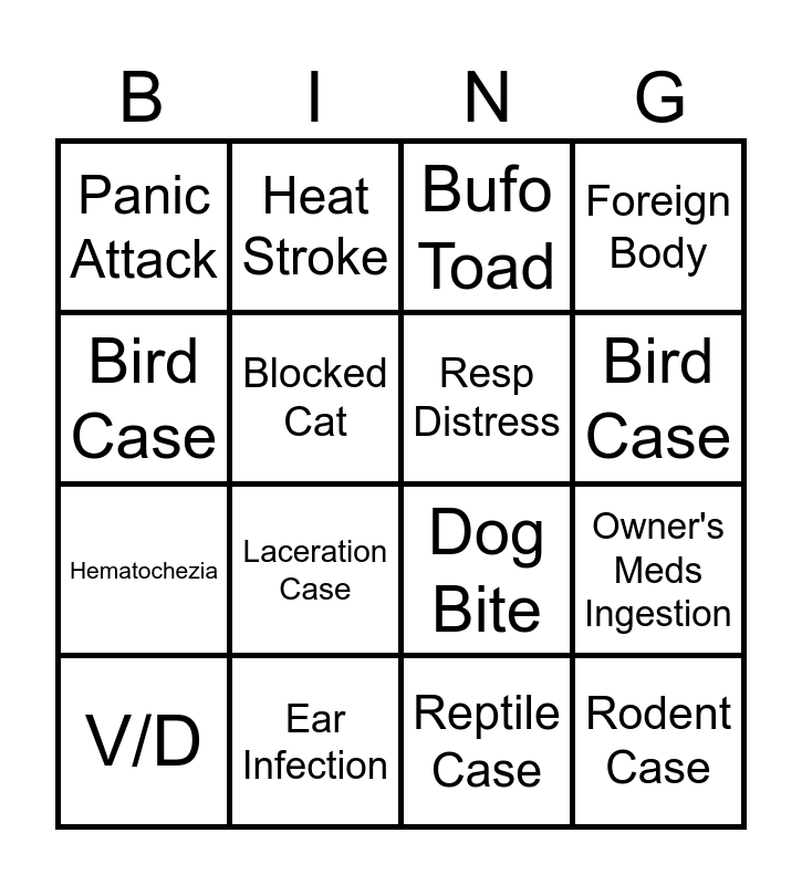 This bingo card has 16 words: V/D, Ear Infection, Bufo Toad, Foreign Body, Bird Case, Heat Stroke, Dog Bite, Owner's Meds Ingestion, Panic Attack, Blocked Cat, Reptile Case, Bird Case, Hematochezia, Laceration Case, Resp Distress and Rodent Case.