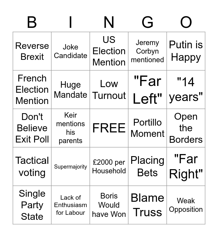 This bingo card has a free space and 24 words: Supermajority, Lack of Enthusiasm for Labour, Low Turnout, Single Party State, Putin is Happy, Reverse Brexit, French Election Mention, Joke Candidate, Portillo Moment, £2000 per Household, "Far Left", Don't Believe Exit Poll, Placing Bets, "Far Right", Huge Mandate, Blame Truss, Open the Borders, US Election Mention, "14 years", Keir mentions his parents, Weak Opposition, Tactical voting, Jeremy Corbyn mentioned and Boris Would have Won.