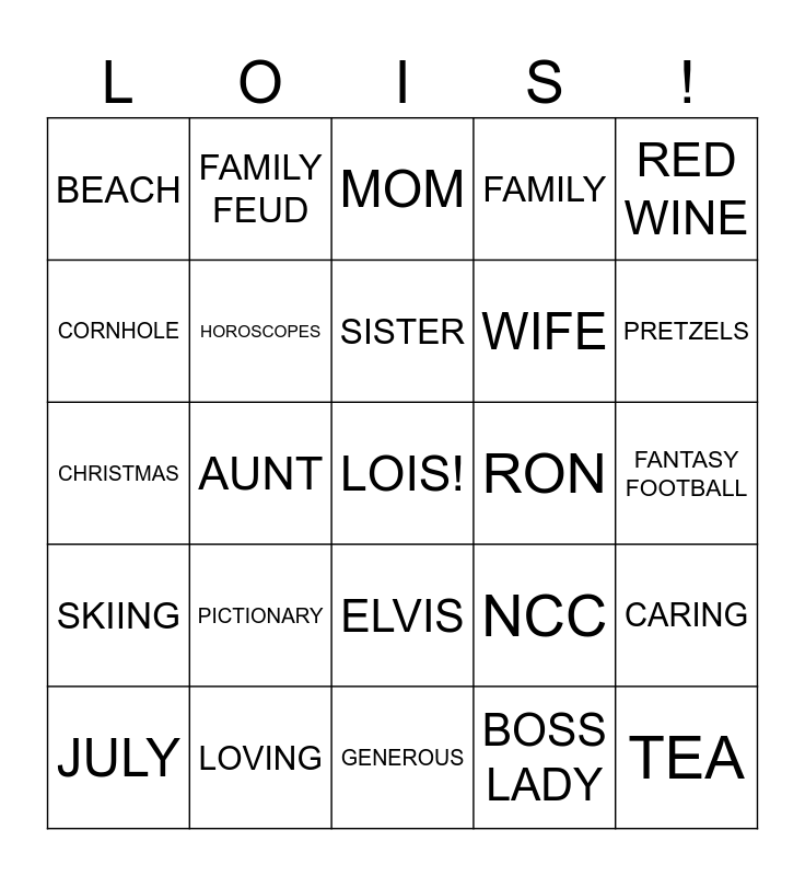This bingo card has a free space and 24 words: PICTIONARY, LOVING, SISTER, JULY, RED WINE, BEACH, CORNHOLE, FAMILY FEUD, RON, ELVIS, WIFE, CHRISTMAS, NCC, CARING, HOROSCOPES, BOSS LADY, FANTASY FOOTBALL, MOM, PRETZELS, AUNT, TEA, SKIING, FAMILY and GENEROUS.