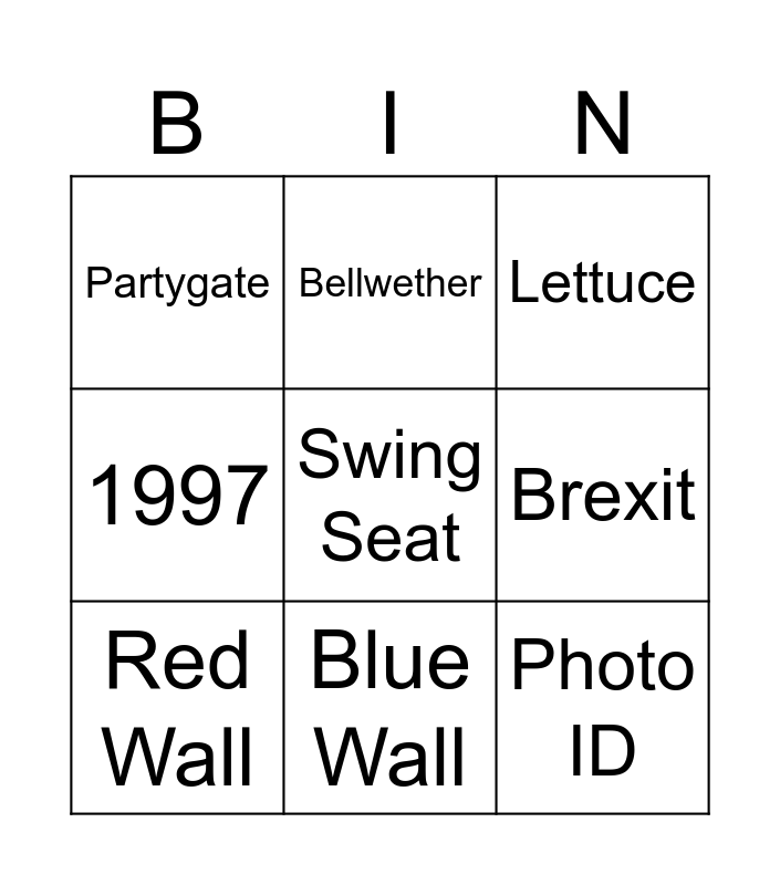This bingo card has 17 words: Free!, Super Majority, Lettuce, Partygate, Tony Blair, 1997, Football Analogy used, Red Wall, Blue Wall, Brexit, New Labour, Portillo Moment, Swing Seat, Bellwether, Photo ID, Dogs at Polling Stations and Still a long way to go.