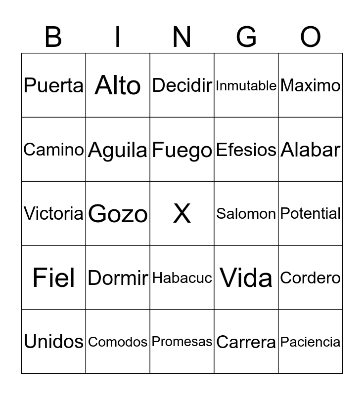 This bingo card has a free space and 24 words: Dormir, Comodos, Fuego, Unidos, Maximo, Puerta, Camino, Alto, Salomon, Habacuc, Efesios, Victoria, Vida, Cordero, Aguila, Carrera, Potential, Decidir, Alabar, Gozo, Paciencia, Fiel, Inmutable and Promesas.