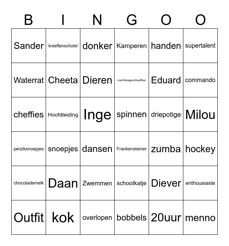 This bingo card has 65 words: Free!, Diever, Lckv, snoepjes, Daan, Thom, kreeftenschotel, Whinegums, Cheeta, kantine, Milou, Kitkat, Inge, handen, Handig, supertalent, commando, Sander, Burgemeester, Dieren, driepotige, spinnen, Kamperen, Outfit, panterprint, 20uur, overlopen, feestjes, cheffies, fanatieke, dansen, Luna, beschuitje, spel, perziksnoepjes, Frankensteiner, vogel, Eduard, hockey, menno, Waterrat, Zwemmen, Hoofdleiding, 25, 29, kok, vrachtwagenchauffeur, overlopen, chocolademelk, schootkatje, instrumenten, streken, sportknotsen, zumba, Encanto, Gek, catan, donker, enthousiaste, bobbels, 26 000, Buschauffeur, breien, spierballen and muziekboks.