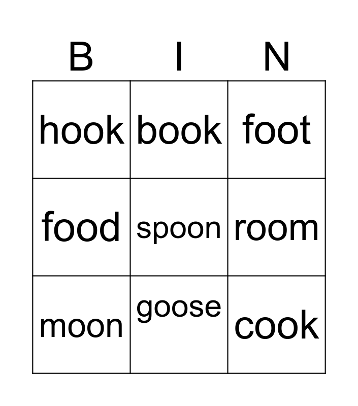 This bingo card has 9 words: moon, foot, book, food, hook, room, spoon, cook and goose.
