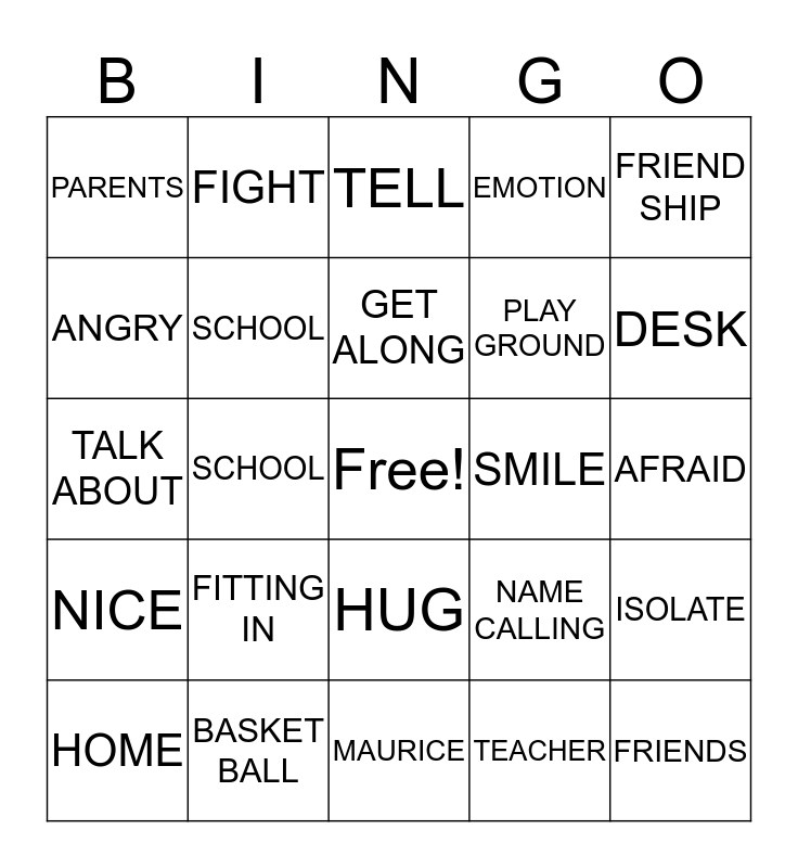 This bingo card has a free space and 47 words: BULLY, FRIENDS, MICHELLE, MAURICE, FITTING IN, EASY, FIGHT, MAKE UP, ANGRY, HAPPY, SCHOOL, EMOTION, ISOLATE, NAME CALLING, HURT, COMFORT, GET ALONG, SMILE, TEASE, FRIEND SHIP, SCHOOL, TEACHER, PARENTS, PLAY GROUND, CLASS ROOM, DESK, HOME, LOVE, HUG, NICE, HAND SHAKE, BOY, GIRL, PLAY, JUMP ROPE, BASKET BALL, AFRAID, UNHAPPY, RESCUE, READ, EXCITED, TELL, TALK ABOUT, SAD, FEELINGS, JOY and SUPPORT.