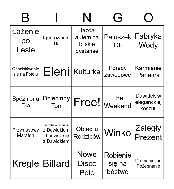 This bingo card has a free space and 24 words: Idziesz spać z Dawidkiem i budzisz się z Dawidkiem, Billard, Kulturka, Kręgle, Fabryka Wody, Łażenie po Lesie, Obściskiwanie się na Fotelu, Ignorowanie Tła, The Weekend, Obiad u Rodziców, Porady zawodowe, Spóźniona Ola, Winko, Zaległy Prezent, Eleni, Robienie się na bóstwo, Dawidek w eleganckiej koszuli, Jazda autem na bliskie dystanse, Karmienie Partenra, Dziecinny Ton, Dramatyczne Pożegnanie, Przymusowy Maraton, Paluszek Oli and Nowe Disco Polo.