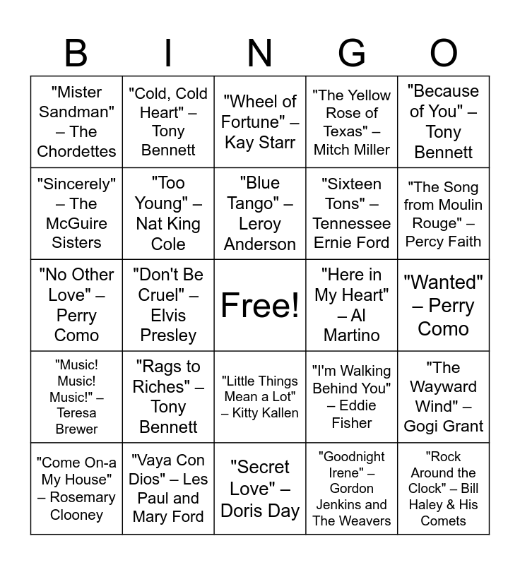 This bingo card has a free space and 34 words: "Mona Lisa" – Nat King Cole, "Goodnight Irene" – Gordon Jenkins and The Weavers, "The Third Man Theme" – Anton Karas, "Sam's Song" – Bing Crosby and Gary Crosby, "Music! Music! Music!" – Teresa Brewer, "Too Young" – Nat King Cole, "Because of You" – Tony Bennett, "Come On-a My House" – Rosemary Clooney, "Cold, Cold Heart" – Tony Bennett, "How High the Moon" – Les Paul and Mary Ford, "Blue Tango" – Leroy Anderson, "Wheel of Fortune" – Kay Starr, "You Belong to Me" – Jo Stafford, "Auf Wiederseh'n, Sweetheart" – Vera Lynn, "Here in My Heart" – Al Martino, "The Song from Moulin Rouge" – Percy Faith, "Vaya Con Dios" – Les Paul and Mary Ford, "No Other Love" – Perry Como, "Rags to Riches" – Tony Bennett, "I'm Walking Behind You" – Eddie Fisher, "Little Things Mean a Lot" – Kitty Kallen, "Sh-Boom" – The Chords, "Mister Sandman" – The Chordettes, "Wanted" – Perry Como, "Secret Love" – Doris Day, "Rock Around the Clock" – Bill Haley & His Comets, "The Yellow Rose of Texas" – Mitch Miller, "Autumn Leaves" – Roger Williams, "Sixteen Tons" – Tennessee Ernie Ford, "Sincerely" – The McGuire Sisters, "Heartbreak Hotel" – Elvis Presley, "Don't Be Cruel" – Elvis Presley, "The Wayward Wind" – Gogi Grant and "My Prayer" – The Platters.