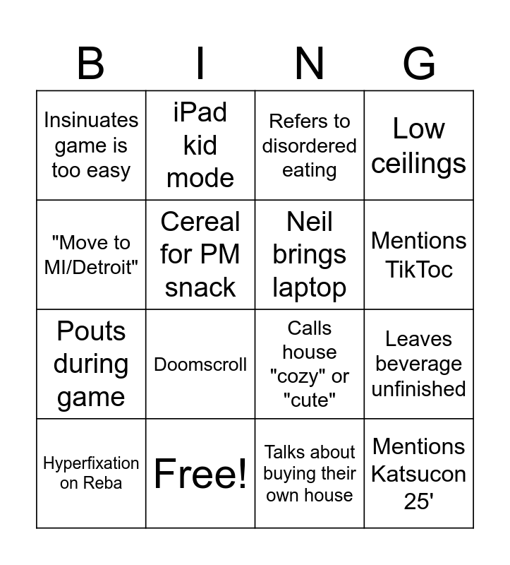This bingo card has 16 words: Free!, Leaves beverage unfinished, Refers to disordered eating, Insinuates game is too easy, Pouts during game, iPad kid mode, Calls house "cozy" or "cute", Talks about buying their own house, "Move to MI/Detroit", Cereal for PM snack, Hyperfixation on Reba, Low ceilings, Doomscroll, Mentions TikToc, Neil brings laptop and Mentions Katsucon 25'.