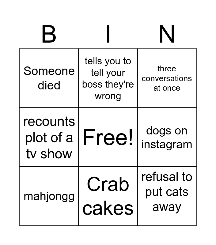 This bingo card has a free space and 8 words: dogs on instagram, three conversations at once, tells you to tell your boss they're wrong, mahjongg, Someone died, refusal to put cats away, recounts plot of a tv show and Crab cakes.