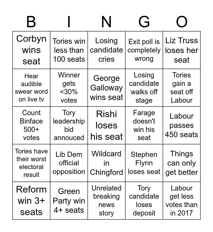 This bingo card has a free space and 24 words: Lib Dem official opposition, Green Party win 4+ seats, George Galloway wins seat, Reform win 3+ seats, Liz Truss loses her seat, Corbyn wins seat, Hear audible swear word on live tv, Tories win less than 100 seats, Farage doesn't win his seat, Wildcard in Chingford, Losing candidate walks off stage, Count Binface 500+ votes, Stephen Flynn loses seat, Things can only get better, Winner gets <30% votes, Tory candidate loses deposit, Labour passes 450 seats, Losing candidate cries, Tories gain a seat off Labour, Tory leadership bid annouced, Labour get less votes than in 2017, Tories have their worst electoral result, Exit poll is completely wrong and Unrelated breaking news story.
