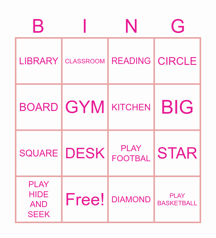 This bingo card has 22 words: Free!, SWIMMING POOL, CLASSROOM, PLAYGROUND, GYM, KITCHEN, LIBRARY, READING, PLAY FOOTBAL, PLAY BASKETBALL, SQUARE, CIRCLE, RECTANGLE, TRIANGLE, DIAMOND, OVAL, STAR, PLAY HIDE AND SEEK, DESK, BOARD, BIG and SMALL.