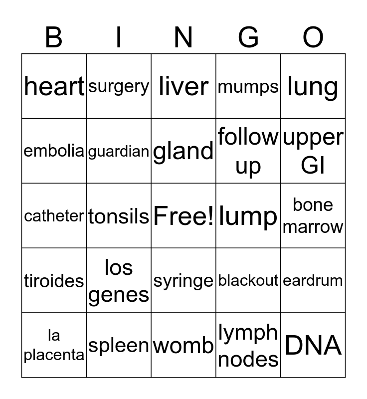 This bingo card has a free space and 24 words: los genes, spleen, gland, la placenta, lung, heart, embolia, surgery, lump, syringe, follow up, catheter, blackout, eardrum, guardian, lymph nodes, bone marrow, liver, upper GI, tonsils, DNA, tiroides, mumps and womb.