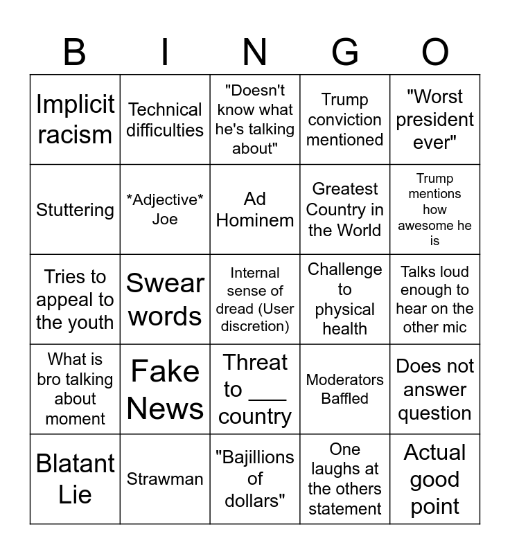 This bingo card has a free space and 24 words: Fake News, Strawman, Ad Hominem, Blatant Lie, "Worst president ever", Implicit racism, Stuttering, Technical difficulties, Challenge to physical health, Threat to ___ country, Greatest Country in the World, Tries to appeal to the youth, Moderators Baffled, Does not answer question, *Adjective* Joe, One laughs at the others statement, Talks loud enough to hear on the other mic, "Doesn't know what he's talking about", Trump mentions how awesome he is, Swear words, Actual good point, What is bro talking about moment, Trump conviction mentioned and "Bajillions of dollars".