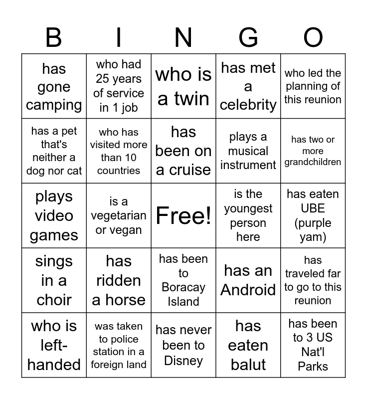 This bingo card has a free space and 35 words: is the oldest sibling, is an only child, was a TED talk speaker, who has visited more than 10 countries, has been to Boracay Island, has met a celebrity, has a pet that's neither a dog nor cat, has been to Las Vegas, has been on a cruise, speaks more than 3 languages, plays video games, who led the planning of this reunion, has been to Claveria, Cagayan, who has ridden a driverless car, has gone camping, is the youngest person here, has eaten balut, is a vegetarian or vegan, sings in a choir, has been to 3 US Nat'l Parks, has an Android, who is left-handed, has traveled far to go to this reunion, was taken to police station in a foreign land, who is a twin, has two or more grandchildren, is growing a vegetable or a flower garden, owns a business, plays a musical instrument, has eaten UBE (purple yam), who has been tear-gassed, has never been to Disney, has ridden a horse, who had 25 years of service in 1 job and can drive car with manual gears.