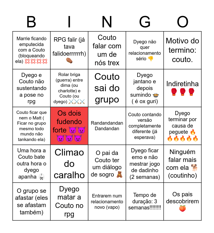 This bingo card has a free space and 24 words: O grupo se afastar (eles se afastam também), Climao do caralho, Couto sai do grupo, Tempo de duração: 3 semanas!!!!!!!!, Motivo do termino: couto., Marrie ficando emputecida com a Couto (bloqueando ela) 💢💢💢💢, RPG falir (já tava falidoerrrrrrh) ⚰️, Couto falar com um de nós trex, Couto contando versão completamente diferente (já esperava), Dyego terminar por causa de peguete 🔥🔥🔥🔥🔥🔥, Couto ficar que nem o Matt ( Ficar no grupo mesmo todo mundo não tankando ela), Rolar briga (guerra) entre dima (ou charlotte) e Couto (ou dyego) ⚔️⚔️⚔️, Dyego ficar emo e não mestrar jogo de dadinho (2 semanas), Ninguém falar mais com ela 🐕 (coutinho), Dyego e Couto não sustentando a pose no rpg, Dyego matar a Couto no rpg, Entrarem num relacionamento novo (vapo), Dyego não quer relacionamento sério 👎, Indiretinha 🥊🥊🥊, Uma hora a Couto bate outra hora o dyego apanha 🥋, Os dois fudendo forte 👿👿👿👿👿, O pai da Couto ter um diálogo de sogro 🧸, Dyego jantano e depois sumindo 🍲 ( é ox guri) and Os pais descobrirem 🍑.