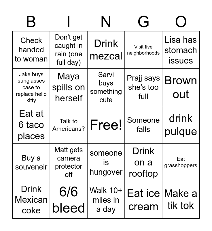 This bingo card has a free space and 24 words: Matt gets camera protector off, 6/6 bleed, Sarvi buys something cute, Drink Mexican coke, Lisa has stomach issues, Check handed to woman, Jake buys sunglasses case to replace hello kitty, Don't get caught in rain (one full day), Someone falls, someone is hungover, Prajj says she's too full, Eat at 6 taco places, Drink on a rooftop, Eat grasshoppers, Maya spills on herself, Eat ice cream, drink pulque, Drink mezcal, Brown out, Talk to Americans?, Make a tik tok, Buy a souveneir, Visit five neighborhoods and Walk 10+ miles in a day.